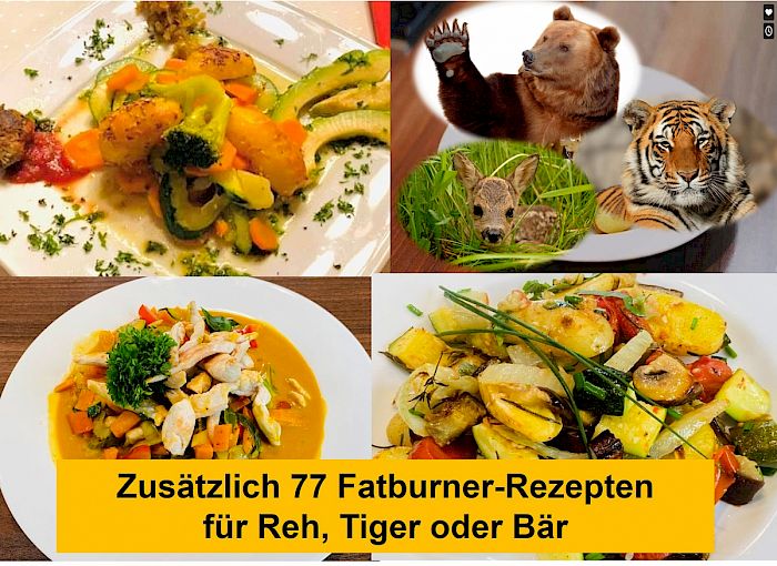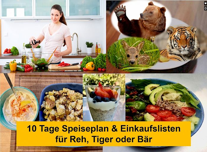 inkl. Typentest, 10 Tage Speiseplan für Dein Naturell & Einkaufsliste, täglichen Ernährungsvideos und Zusatzvideos und zusätzlichen 77 basischen Entsäuerungs-Rezepten für Reh, Tiger und Bär im Wert von 129,90 € für nur 49,90 € !!