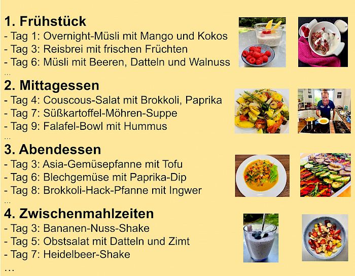 Du musst Dir nicht überlegen, welche Lebensmittel Du essen darfst und welche nicht. Wir wählen die Rezepte für Dich aus. Unser 10 Tage Speiseplan sorgt für den perfekten Einstieg in eine basische Ernährung. Wenn Du danach am Ball bleibst, ist Dein Erfolg langanhaltend und nachhaltig. Wir betreuen Dich bis zu einem Jahr, um Hindernisse in der Ernährung gemeinsam zu lösen.Du bekommst zudem 66 “Schlank statt sauer” Rezepte, für die Zeit nach dem Coaching. Wir verzichten auf komplizierte Trainingspläne und 08/15 Diätpläne. Alles ist einfach durchzuführen und die Gerichte sind super lecker.