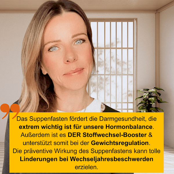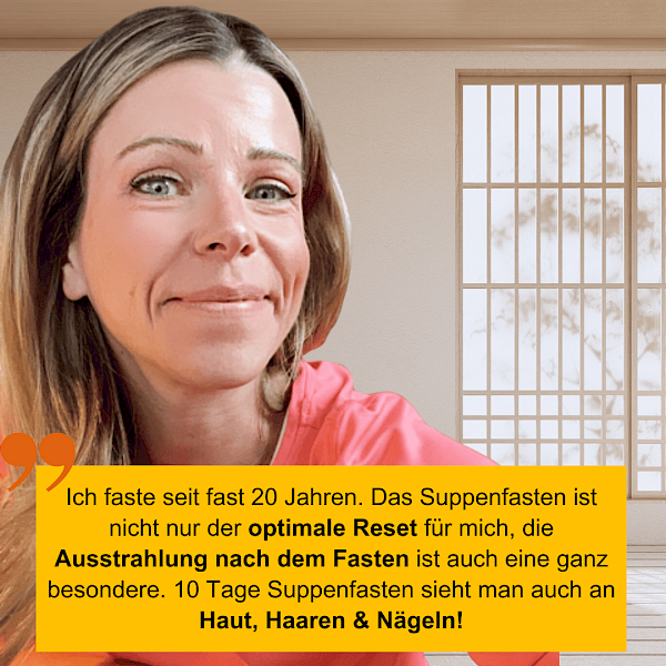 „Mit den Wechseljahren hat mein Bauchfett zugenommen und das Fasten regt meine Fettverbrennung wieder an. Ich habe gelernt, dass der Darm die Schilddrüse triggert, das Fasten mit Suppen reguliert meinen Darm und aktiviert meinen Stoffwechsel.“