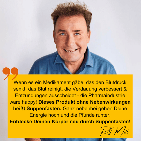 Ralf Moll ist der Begründer des Original Suppenfastens nach Ralf Moll. Er hat das Suppenfasten vor 30 Jahren entwickelt & in seinem eigenen Fastenzentrum im Schwarzwald perfektioniert. Bereits 100.000 Menschen haben bereits erfolgreich mit leckeren Suppen mit uns gefastet.