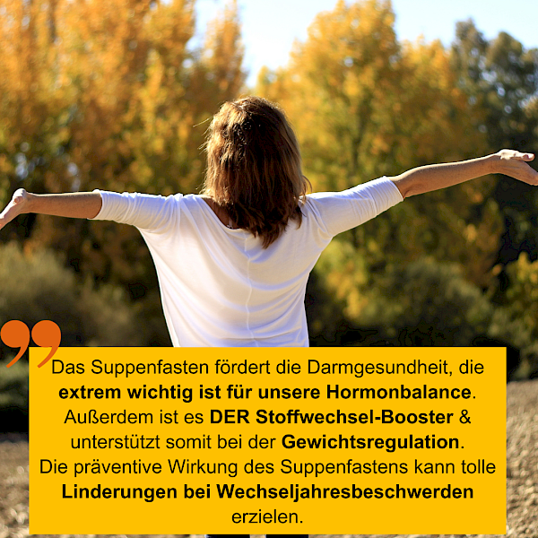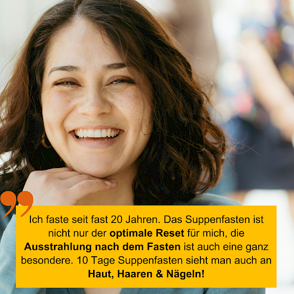 „Mit den Wechseljahren hat mein Bauchfett zugenommen und das Fasten regt meine Fettverbrennung wieder an. Ich habe gelernt, dass der Darm die Schilddrüse triggert, das Fasten mit Suppen reguliert meinen Darm und aktiviert meinen Stoffwechsel.“